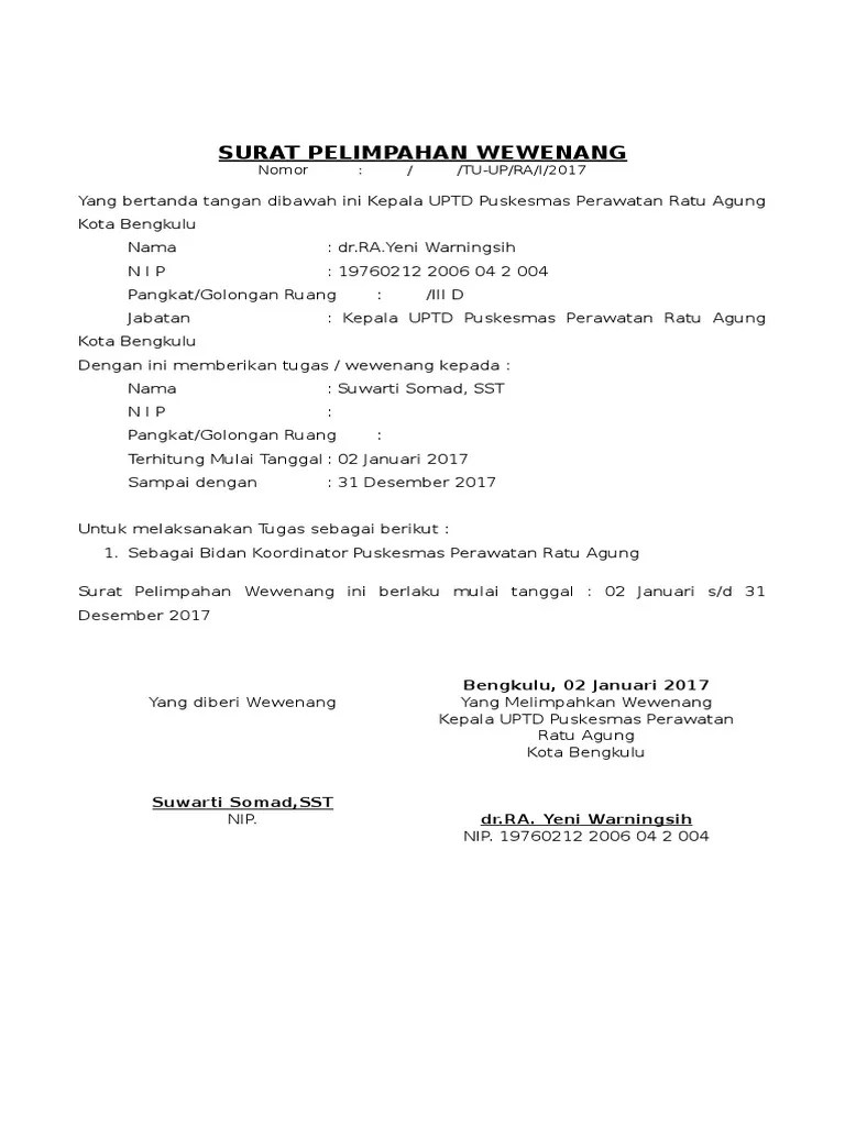 Berikut admin bagikan langsung contoh surat pelimpahan tugas seperti gambar diatas. 297 contoh surat kuasa download doc cara membuat. Informasi mengenai contoh surat pelimpahan tugas karena cuti. 2 3 9 2 2 sop pendelegasian wewenang docx. Format penulisan surat tugas limpah/pendelegasian kewenangan dari tenaga medis di puskesmas kepada perawat dan atau bidan di puskesmas adalah: